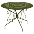 Mesa MONTMARTRE Ø96cm de acero galvanizado para EXTERIOR de la marca francesa FERMOB®. La estructura está hecha de acero con dos capas de pintura anticorrosión para exterior de alta calidad con la parte superior perforada. Esta mesa encaja con las sillas de la misma colección creando una ambiente romántico, una colección icónica del arte francés.