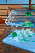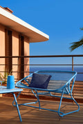 Banco con respaldo para 2 personas SIXTIES de aluminio para el EXTERIOR de la marca francesa FERMOB®. Banco de una una sola pieza y ultraligero, hecho de aluminio con dos capas de pintura para exterior de alta calidad muy resistente. Los asientos de esta colección están tejidos a mano sobre un marco de aluminio. Los alambres se extruyen a partir de fibras de polietileno para exterior antes siendo trenzado a mano, de la manera tradicional. Esto significa que cada artículo es único y requiere de 8 a 19 horas de trabajo manual. La colección Sixties destaca por su efecto retro visualmente llamativo. Los asientos están trenzados con un tejido redondo en forma de "scoobie".