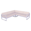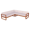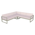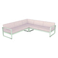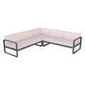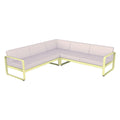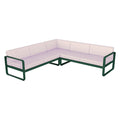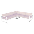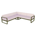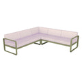 Composición 2 BELLEVIE PEARL para el EXTERIOR de la marca francesa FERMOB®. La estructura está hecha de aluminio con dos capas de pintura para exterior de alta calidad muy resistente. Los cojines Pearl, con una trama mas gruesa y tacto muy agradable son para el exterior TTE y poliuretano resistente a la deformación diseñados para que disfrute de las celebraciones familiares en su jardín o comedor. Desenfundables, los cojines Pearl, de este sofá de jardín son sorprendentemente fáciles de mantener y muy resistentes, la tela para exteriores 100 % acrílica teñida en solución resiste las manchas, el moho, los desgarros y la abrasión. Compuesto por un módulo izquierdo de 2 plazas, un módulo derecho de 2 plazas y un módulo de esquina, invita a pasar momentos al aire libre, sin complicaciones. Sus suaves curvas traducen la dolce vita: en este elegante sofá, cómodamente sentado, con un montón de revistas colocadas a tu lado y una lámpara para prolongar tu lectura al caer la noche.