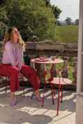 Silla con reposabrazos AIRLOOP de acero para el EXTERIOR de la marca francesa FERMOB®. Está hecha de acero con dos capas de pintura para exterior de alta calidad muy resistente. Gracias a sus anillas de acero forjadas a mano de manera tradicional, cada silla es única y exclusiva. Añada un toque romántico y además moderno a su salón o jardín y disfrute de agradables cenas y puestas de sol con sus amigos o familia.