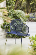 Banco de conversação em aço LORETTE para uso EXTERNO da marca francesa FERMOB ®. É feito de aço com duas camadas de tinta externa de alta qualidade e durabilidade . Os encostos dos assentos são feitos de aço perfurado a laser, com um delicado padrão perfurado inspirado no dos moucharabiehs. Colocado no seu terraço ou nos fundos do jardim da sua casa de campo, este banco é perfeito para compartilhar segredos e segredos em total privacidade. Este banco, inspirado nas famosas confidentes, poltronas com assentos duplos, um de frente para o outro, permite que você converse sem virar a cabeça. Robusto, preparado para enfrentar todas as intempéries; e também aos raios solares mais fortes, graças à resistência aos raios UV da sua tinta exterior de alta qualidade. Graças ao seu estilo atemporal, não hesite em combiná-lo com o restante da coleção LORETTE em qualquer lugar do seu jardim ou terraço.