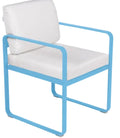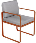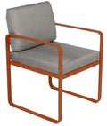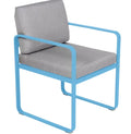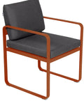 Cadeira BELLEVIE com braços para uso EXTERNO da marca francesa FERMOB ®. A estrutura é feita de alumínio com duas camadas de tinta externa de alta qualidade e alta resistência . Graças a este tecido para áreas externas 100% acrílico tingido em solução, resistente a manchas, mofo, rasgos e abrasão, mas também graças à sua estrutura 100% alumínio revestida com tinta em pó de poliéster, sua cadeira de jantar Bellevie pode suportar os elementos e os climas mais severos. A almofada do encosto é equipada com um bolso que desliza sobre a estrutura para esconder a parte metálica do encosto da cadeira. As almofadas são feitas de TTE e poliuretano resistente à deformação para uso externo, projetadas para você desfrutar de uma conversa animada ou uma refeição na sala de estar ou no jardim da sua casa.